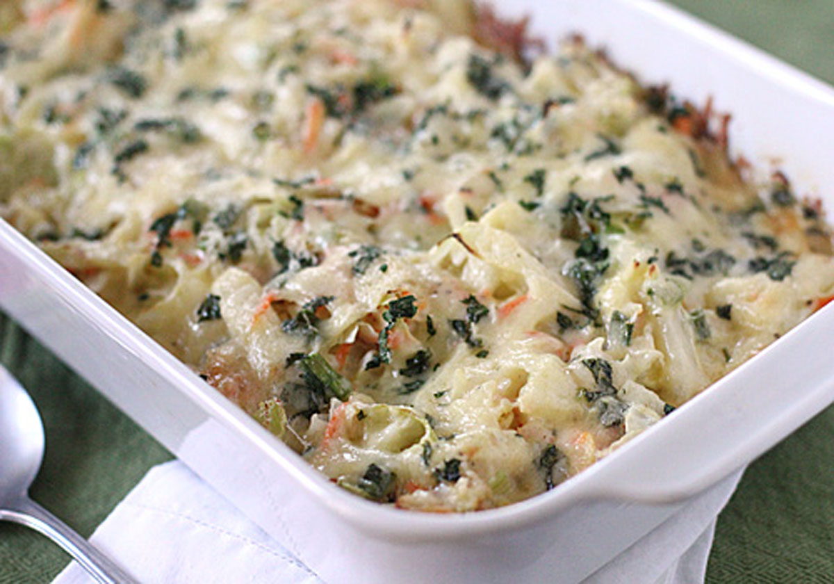 The original recipe, although good, was a bit too subdued and, frankly, plain for my taste buds as well as a little on the dry side. To maximize flavor and texture, I added grated carrots for sweetness and scallions for a mild onion taste. Since it was on the dry side, I omitted the flour and was left with a delicate sauce with small pockets of custard from the eggs and half-and-half. But what really makes your fork go back for more? More cheese. The deep flavors of the cheeses help to make this dish a second helping type of side.