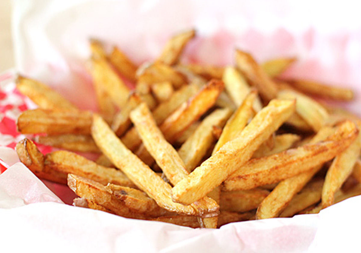 Unlike the conventional twice fried method for frying potatoes, this method starts with cold oil. I couldn’t believe it myself when I first read it, but it really does work. The fries turn out golden and crispy. The good news– less oil is absorbed. Low fat fries? Yes, please! The other great point to this recipe is that the potatoes all fry at once. No batch after batch hassle. So while your potatoes are frying, you can finish last minute dinner prep. As soon as the potatoes are done, dinner is served.