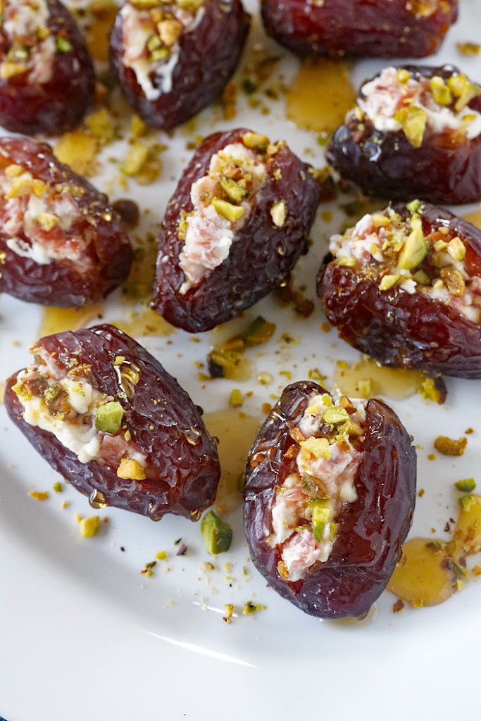- Evenly pipe or scoop a small portion of the cheese mixture into each date. Arrange the dates, filling side up, on a large plate or platter. Drizzle honey over the dates and top with pistachios. Serve with toothpicks or cocktail forks. Stuffed dates can be made up to 2 days in advance, covered and stored in the refrigerator. Bring to room temperature and drizzle with honey before serving. Enjoy!
