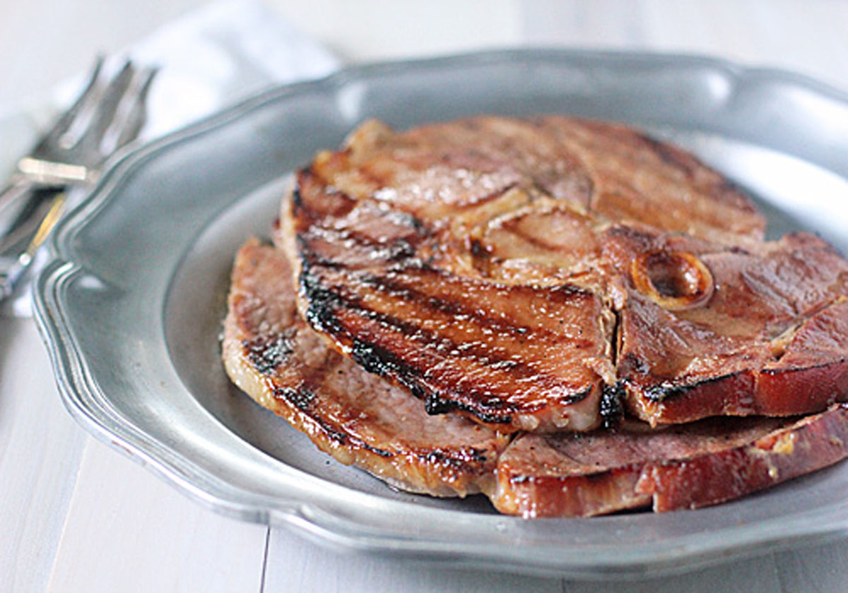 A simple marinade of brown sugar, apricot jam, and Dijon mustard is all you need to achieve a perfectly tasty and juicy glaze for a couple of bone-in ham steaks. Marinate the ham steaks the night before, then grill them over some glowing embers until caramelized and warmed through. This is dinner on the table in twenty minutes.