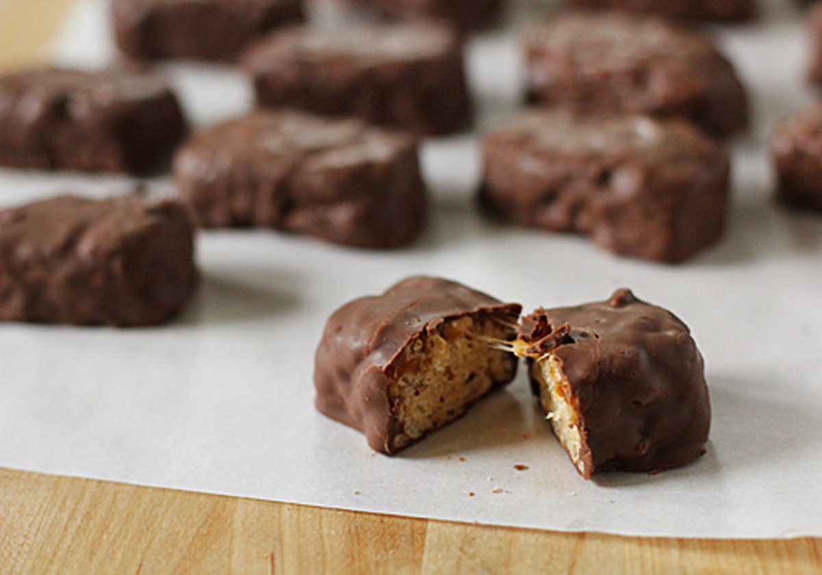 I call these Whatchamacallits, but taste-wise and texturally they came out like the love child of Whatchamacallits and 100 Grands (another favored candy bar). The foundation is a crisped rice base to which I added a bit of peanut butter. I made a stiff caramel and poured it over the base because I wanted a nice pull when I bit into the bar. Then I cut them into small rectangles. Just before coating in melted chocolate, I gave each bar a gentle squeeze to compact it and round the edges. To avoid the sheer torture of waiting for the chocolate to set, I popped a few in the freezer.