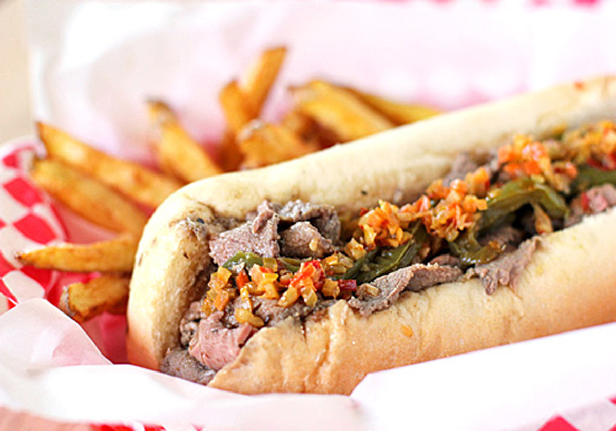 - To assemble the sandwich, spoon some juice directly onto the roll. Top with the soaked meat followed by the green peppers and giardinera. Enjoy!