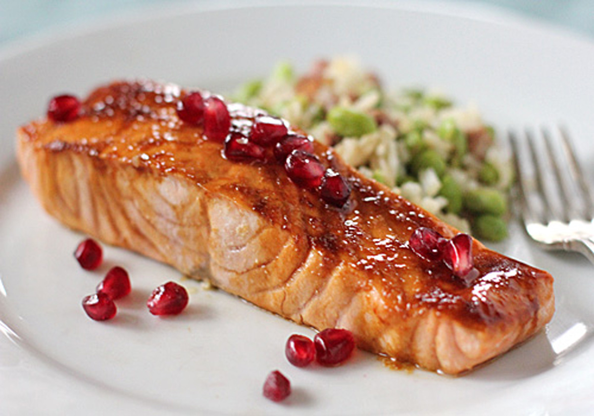 - Preheat the broiler. Transfer the salmon to a large rimmed baking sheet. Season each fillet with salt and brush with half of the glaze mixture. Broil 4 inches from the heat for about 3 minutes, or until the fillets begin to brown. Brush the fillets with the remaining glaze and broil for about 3 minutes longer, or until richly glazed and the fish is just cooked through. Transfer the fillets to plates and garnish with pomegranate seeds. Serve immediately. Enjoy!