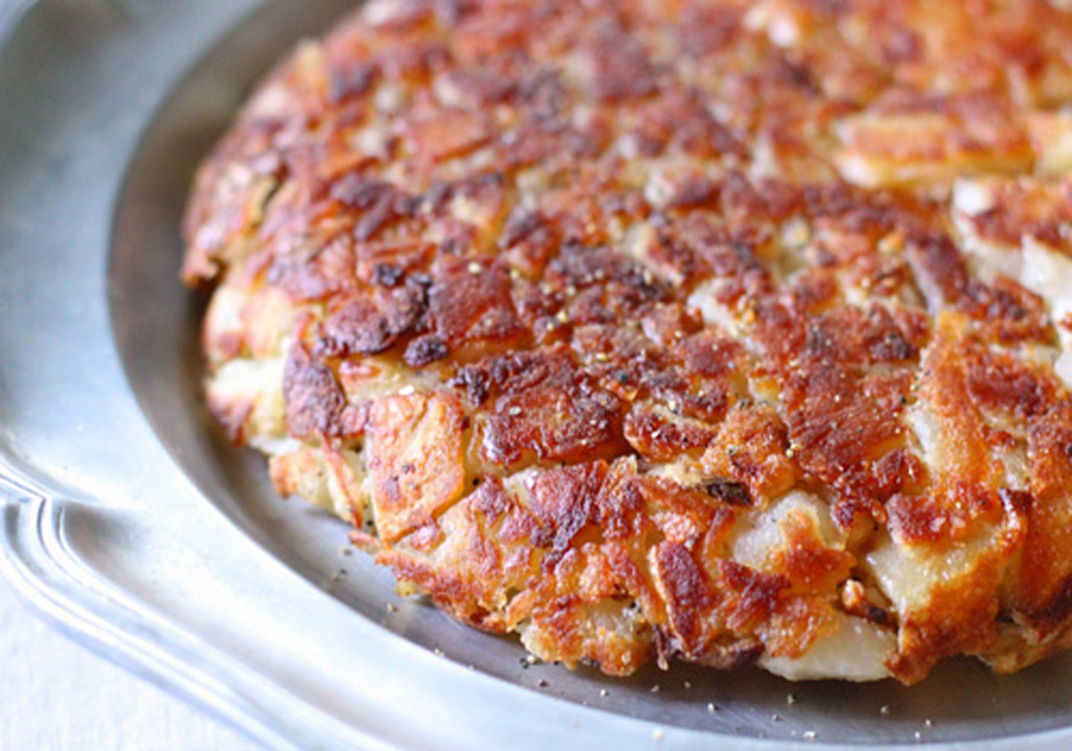 - In a 10-inch non-stick, oven-proof skillet, heat the oil and butter over medium heat. When the butter stops foaming, add the potatoes and season with the nutmeg, salt, and pepper. Immediately begin turning the potatoes to thoroughly mix in the seasonings, oil, and butter. Using a wide, flat spatula, flatten the potatoes to a smooth, solid layer. Reduce the heat to medium-low and cook for 5-8 minutes. Near the end of cooking time, shake and rotate the pan quickly in a clockwise motion to loosen the potato cake from the sides and bottom of the pan. The bottom should be browning nicely at this point.