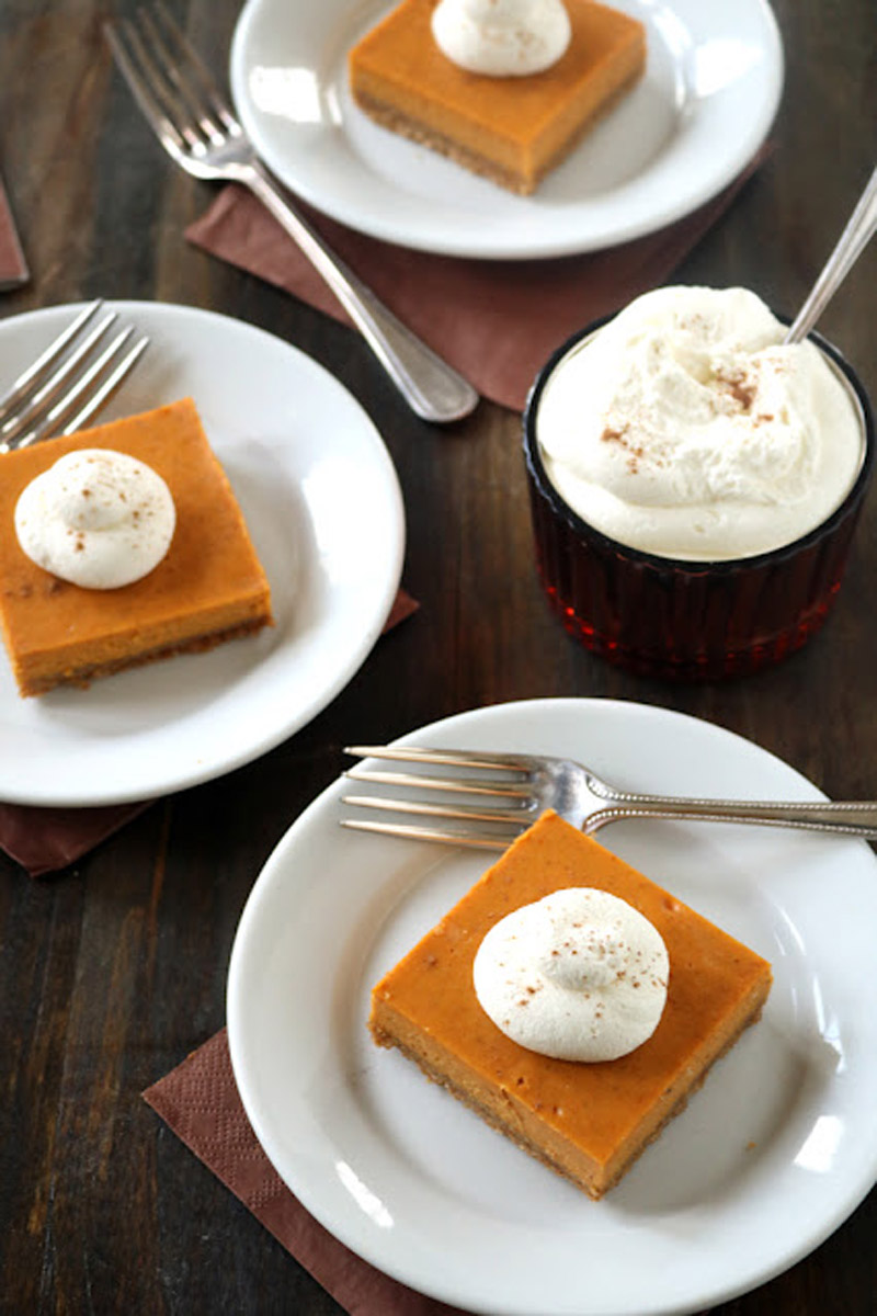 - In the food processor, purée the cream cheese, remaining 1 ⅓ cups sugar , lemon juice, vanilla and pumpkin mixture until smooth, about 2 minutes. Add eggs, one at a time, until incorporated. Scrape down the sides of the bowl and pulse until no lumps remain. Pour over cooled crust and spread into even layer. Bake until edges are slightly puffed and center is just set, 45 to 50 minutes. Let cheesecake cool in pan on wire rack for 2 hours. Cover pan with plastic wrap and refrigerate cheesecake for at least 3 hours or up to 24 hours. Using foil overhang, lift cheesecake out of pan. Cut into 12-24 squares. Serve with sweetened whipped cream if using. Enjoy!