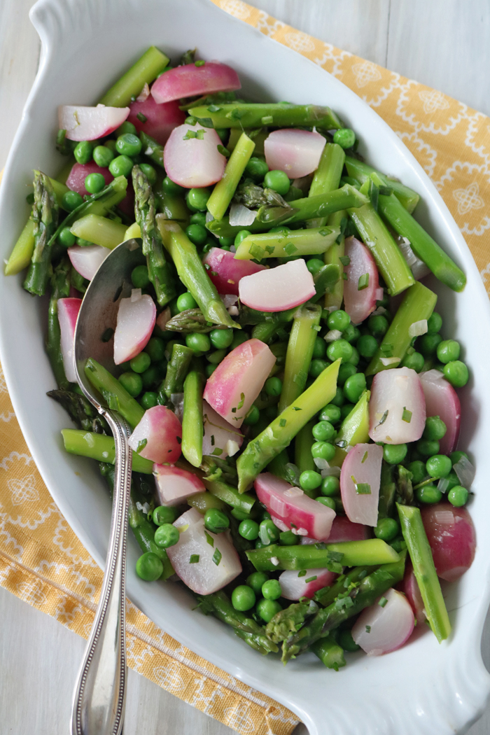 Spring is in the air and in my kitchen! Radishes, asparagus, sweet peas and fresh herbs are a welcome addition to any springtime menu or meal and they come together beautifully in this dish.