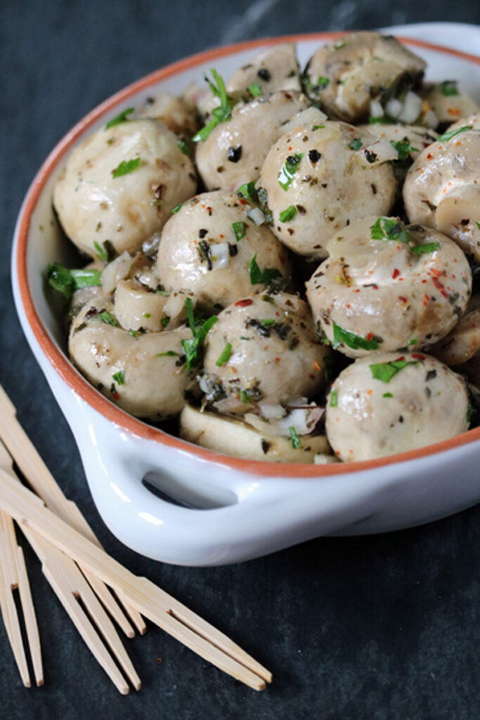 - Meanwhile, in a small bowl, mix together everything but the parsley. Add the mixture to the mushrooms and stir gently to coat. Cover and refrigerate overnight. Allow the mushrooms to rest at room temperature for 15-20 minutes. Add the parsley, gently stir, and transfer to a serving dish. Enjoy!