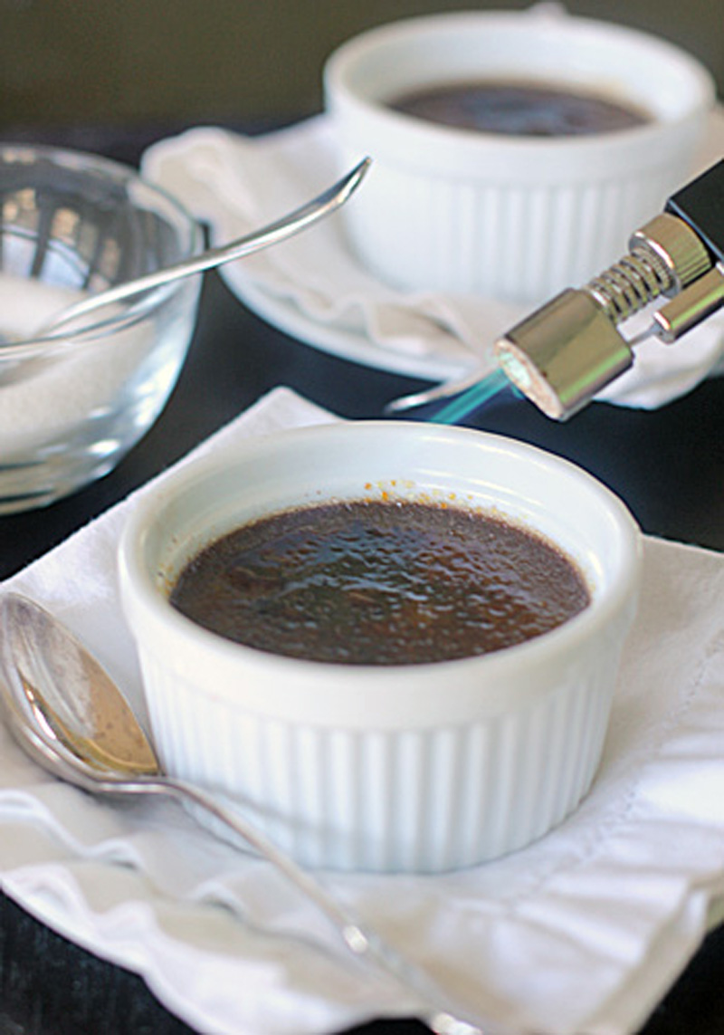 I like to use a kitchen torch to brûlée the sugar. It does the job nicely and provides a little after-dinner entertainment, but you can use the broiler element in your oven. ust be careful that the oven doesn’t warm the custard too much. Once the sugar hardens, break the sweet “glass” and dig your spoon into the creamy goodness.