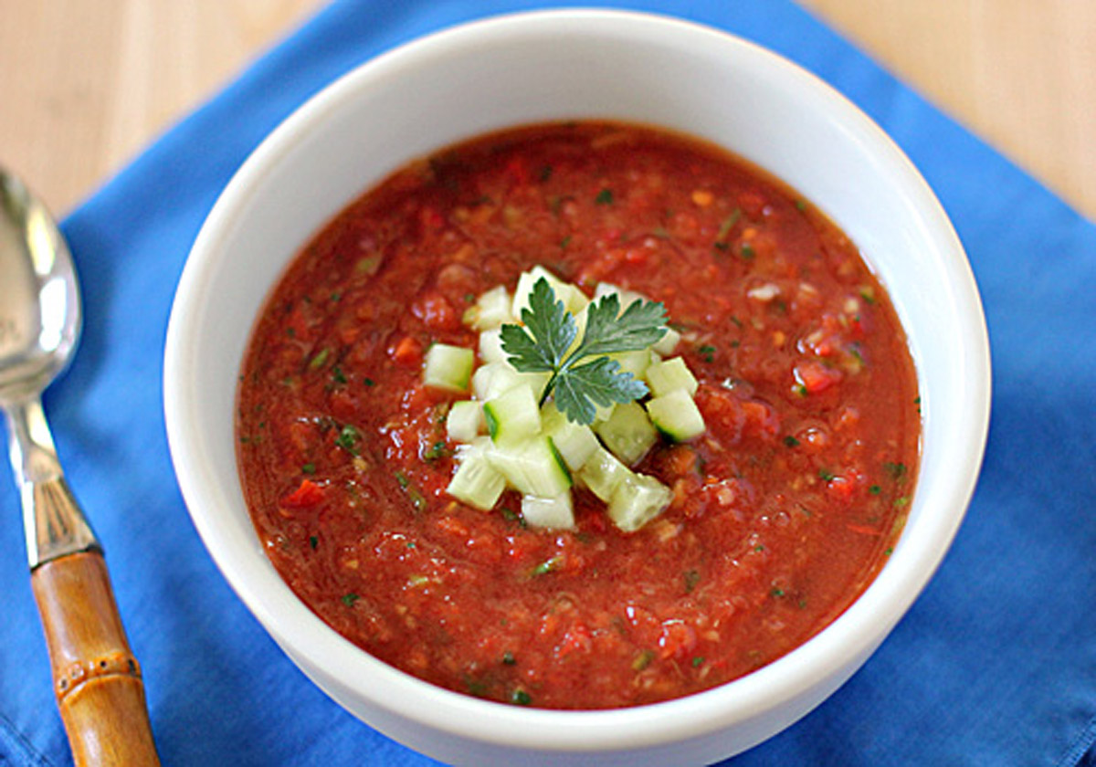 Gazpacho is a chilled tomato-based raw vegetable soup that originates from southern Spain. There are many variations in color and flavor of the original gazpacho, which included fresh summer vegetables and stale bread. Nowadays, one can find recipes for gazpachos that include fruit and seafood, as well as ingredients like avocado and cucumber that alter the color. This tomato-based recipe stays fairly close to the roots of gazpacho with the exception of the stale bread. I keep the bread on the side for dipping.