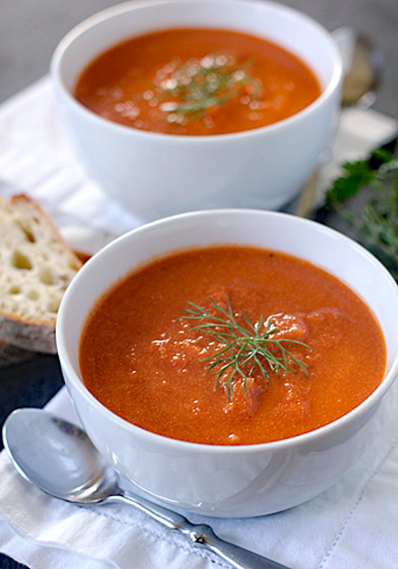 Almost everybody has eaten tomato soup in at least one of its many incarnations. Maybe you’ve graduated from the beloved Campbell’s of your youth and tried making it in your own kitchen. I think that one can never have enough recipes for it. There are so many delicious variations on the classic that it begs for experimentation. Which brings me to this one.