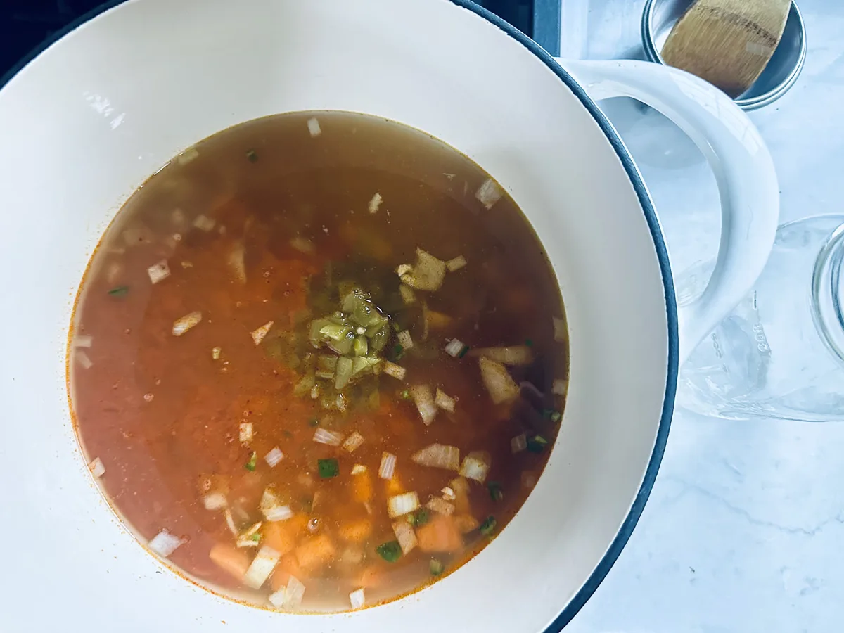 Chiles add a touch of spice to the soup. I use a mixture of canned green chiles and fresh jalapeño. To pack a little more heat, use the ribs and seeds from the jalapeño if desired.