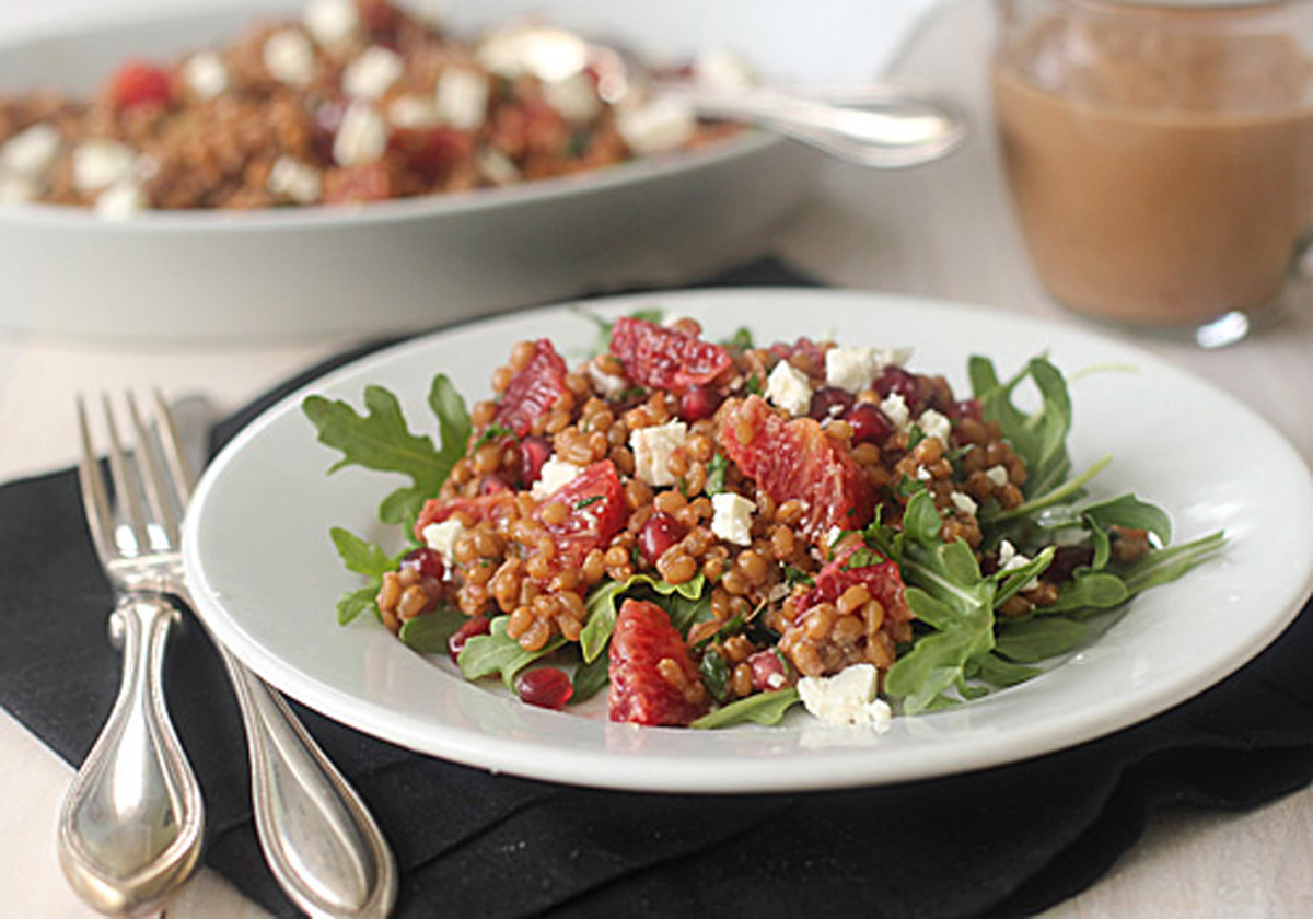 - Add 6 tablespoons of the vinaigrette to the warm wheat berries. Add the orange pieces, feta, pomegranates, and parsley. Toss to combine. Season to taste with kosher salt and freshly ground black pepper. Serve as a side to a main dish or as a salad on a bed of arugula. Enjoy!